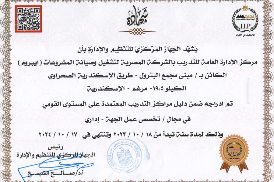Under the guidance & supervision of His Excellency the Minister of Petroleum and Mineral Resources, Eng. Tareq Al-Mulla, EPROM Company, headed by Chem. Mohamed Barakat, Chairman of the Board of Directors and Managing Director, succeeded in including EPROM name in the directory of accredited training centers, at a national level, in the field of its work specialization, from 18/10/2023 to…