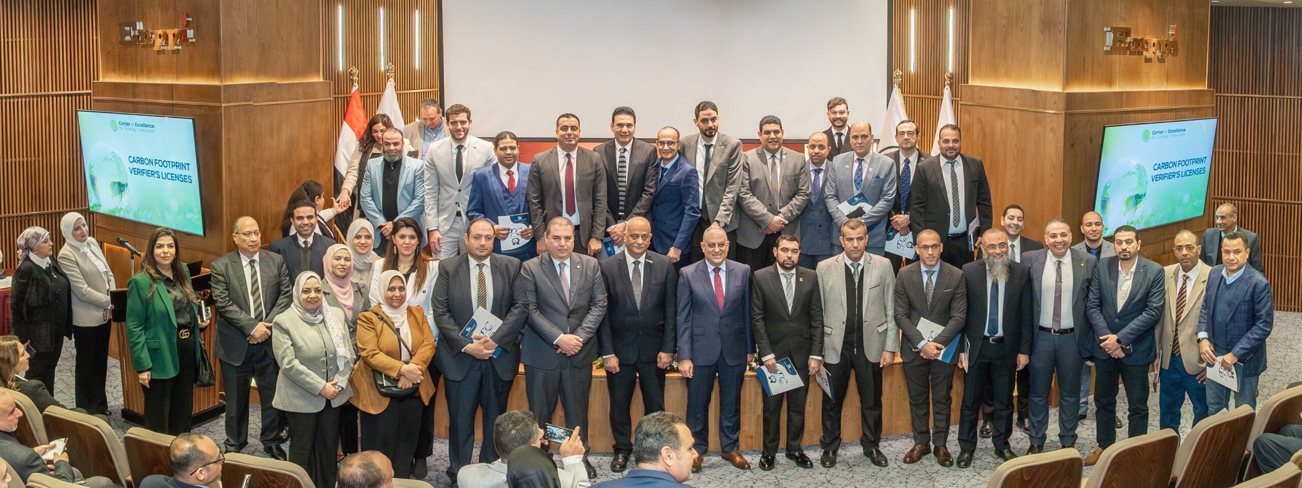 At the end of the ceremony, Eng. Wael Lotfy, Eng. Hossam Assad, and Dr. Khaled Sofy congratulated the graduates and presented them with their official “Carbon Footprint Verifier’s License” certificates.